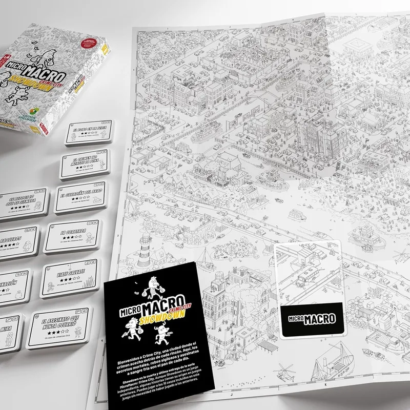MicroMacro: Crime City funciona así: despliegas un mapa enorme de una ciudad dibujada en blanco y negro, abres el sobre de un caso, lees la primera carta y empiezas a buscar en el mapa. Cada respuesta correcta desbloquea la siguiente pista. Sigues el rastro de personajes, escenas y cronologías hasta que el caso está resuelto.