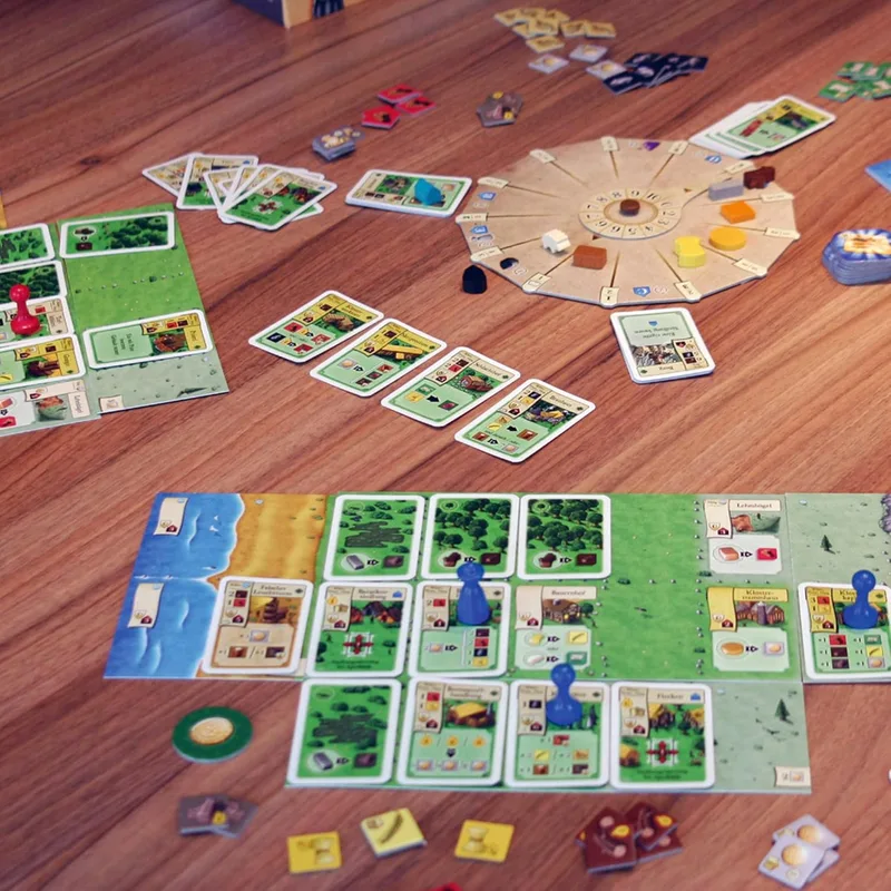 Eso significa que los edificios de producción se vuelven más eficientes automáticamente con el paso del tiempo, sin que los jugadores tengan que hacer nada para mejorarlo. La consecuencia sobre la planificación es significativa: construir un molino en la ronda dos da menos grano que construirlo en la ronda seis —porque en la seis la rueda está más avanzada— pero el molino construido en la dos ha estado produciendo durante más rondas. El cálculo de retorno de inversión de cada edificio depende de cuándo en la partida se construye, lo que añade una dimensión temporal de planificación que ningún otro worker placement tiene.