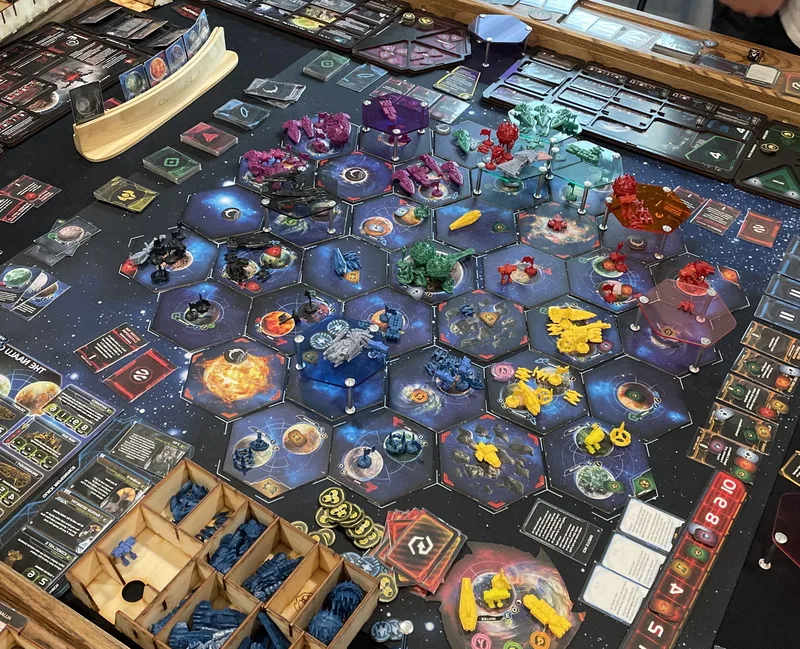 Esa negociación real —no simulada por una carta, sino conversación directa entre jugadores— es lo que hace que Twilight Imperium se sienta más como una campaña de rol de ciencia ficción que como un eurogame.