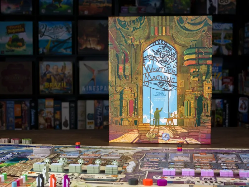 Weather Machine es el eurogame más denso de Vital Lacerda. Un único trabajador por jugador, laboratorio personal modular, investigación de fenómenos climáticos y prototipos que corrigen el tiempo extremo